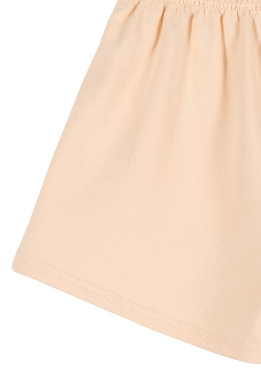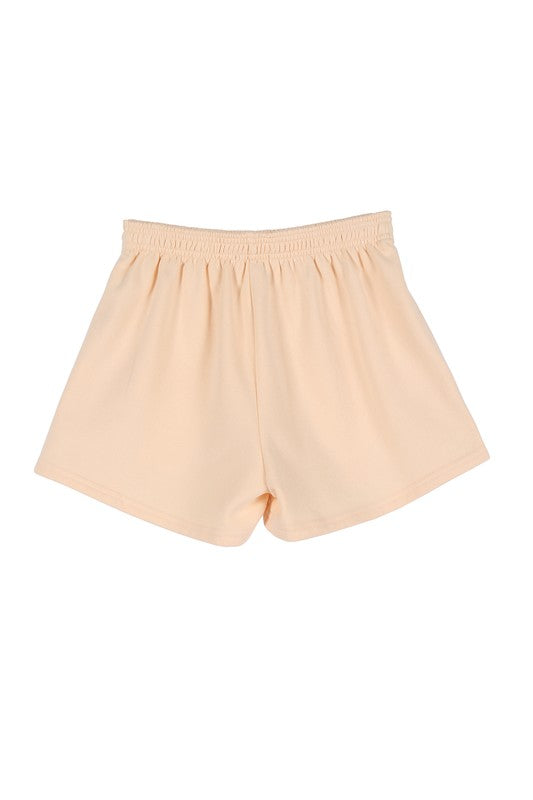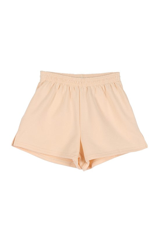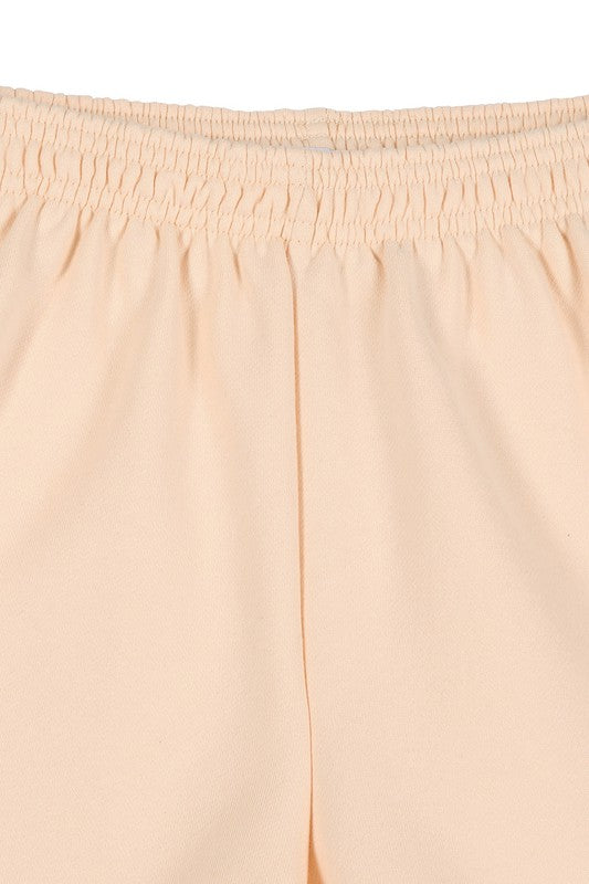 - Cream sweat shorts, soft handfeel with peach finish, elastic band at waist, side slit