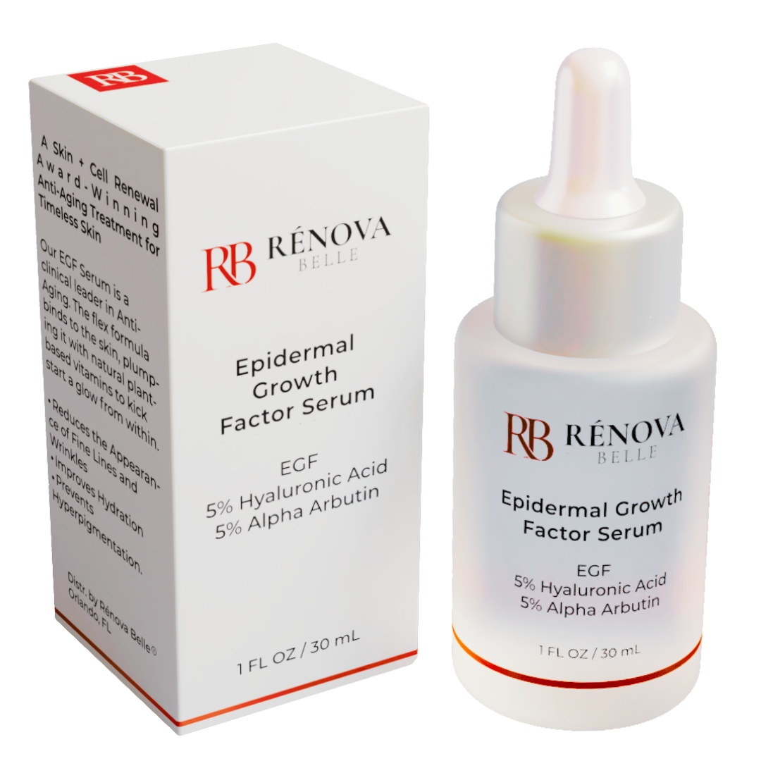 Rénova's EGF Serum is one of our Best Sellers and features EGF + Hyaluronic Acid 5% + Alpha Arbutin 5% - What’s unique about the EGF Serum is a bio-engineered skin-identical peptide that mimics your skin’s renewal process. It is the small active peptide portion of the larger epidermal growth factor (EGF) protein molecule. The protein helps to renew skin to appear more youthful. EGF serum keeps skin young and healthy but it disappears from our skin as we age. Growth factors are signals that tell your skin cells to behave like young, healthy cells." + "