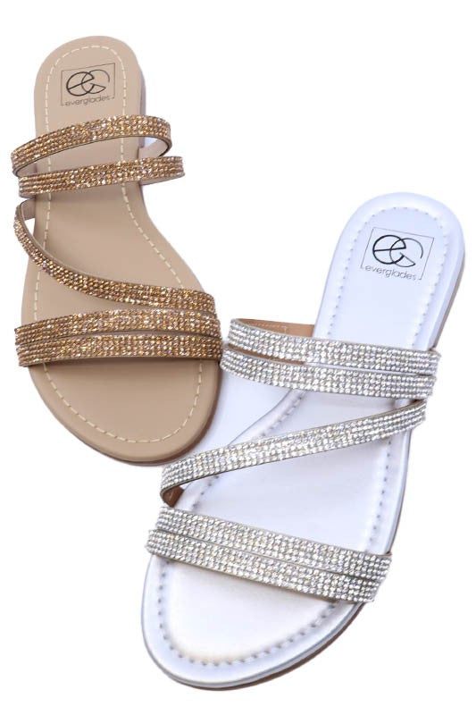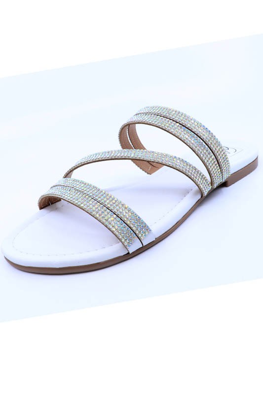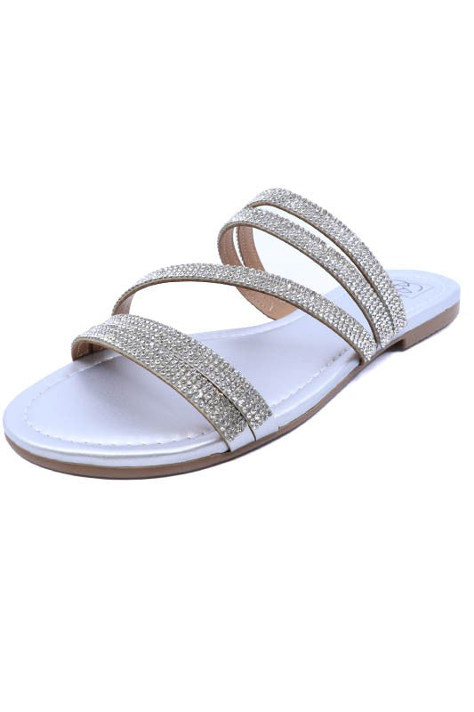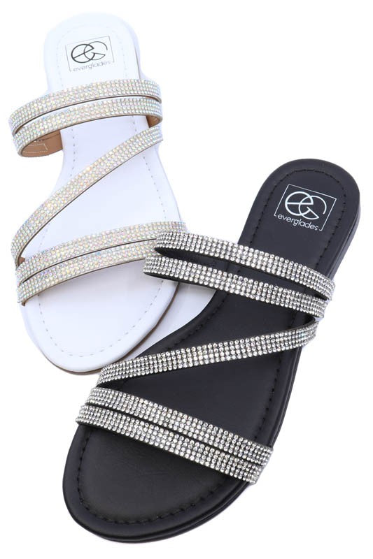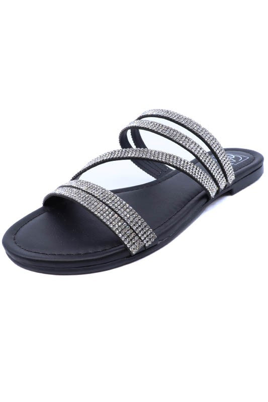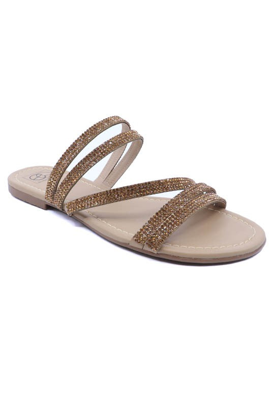 Strappy slide sandal with rhinestone detail and lightly padded insole.