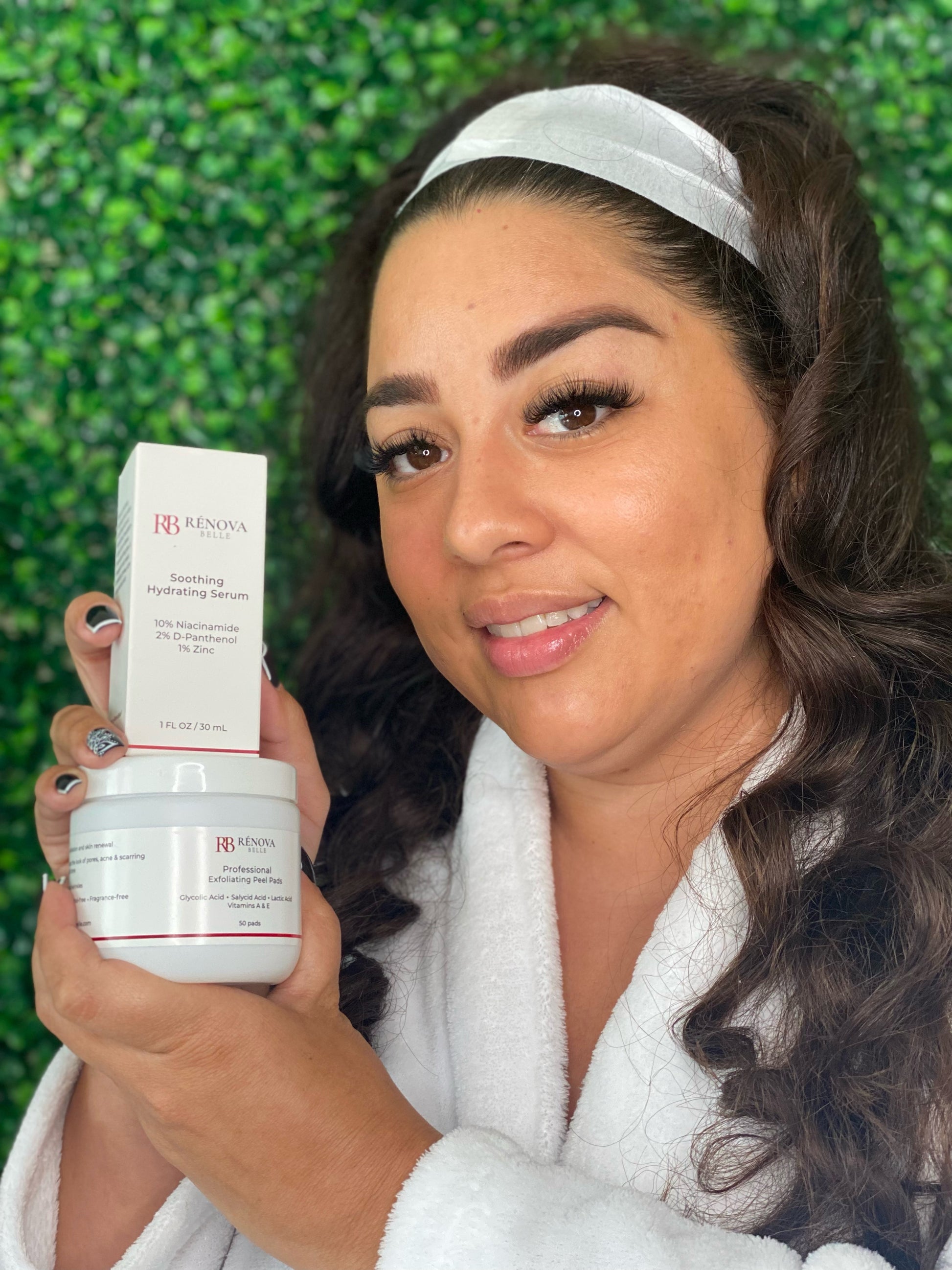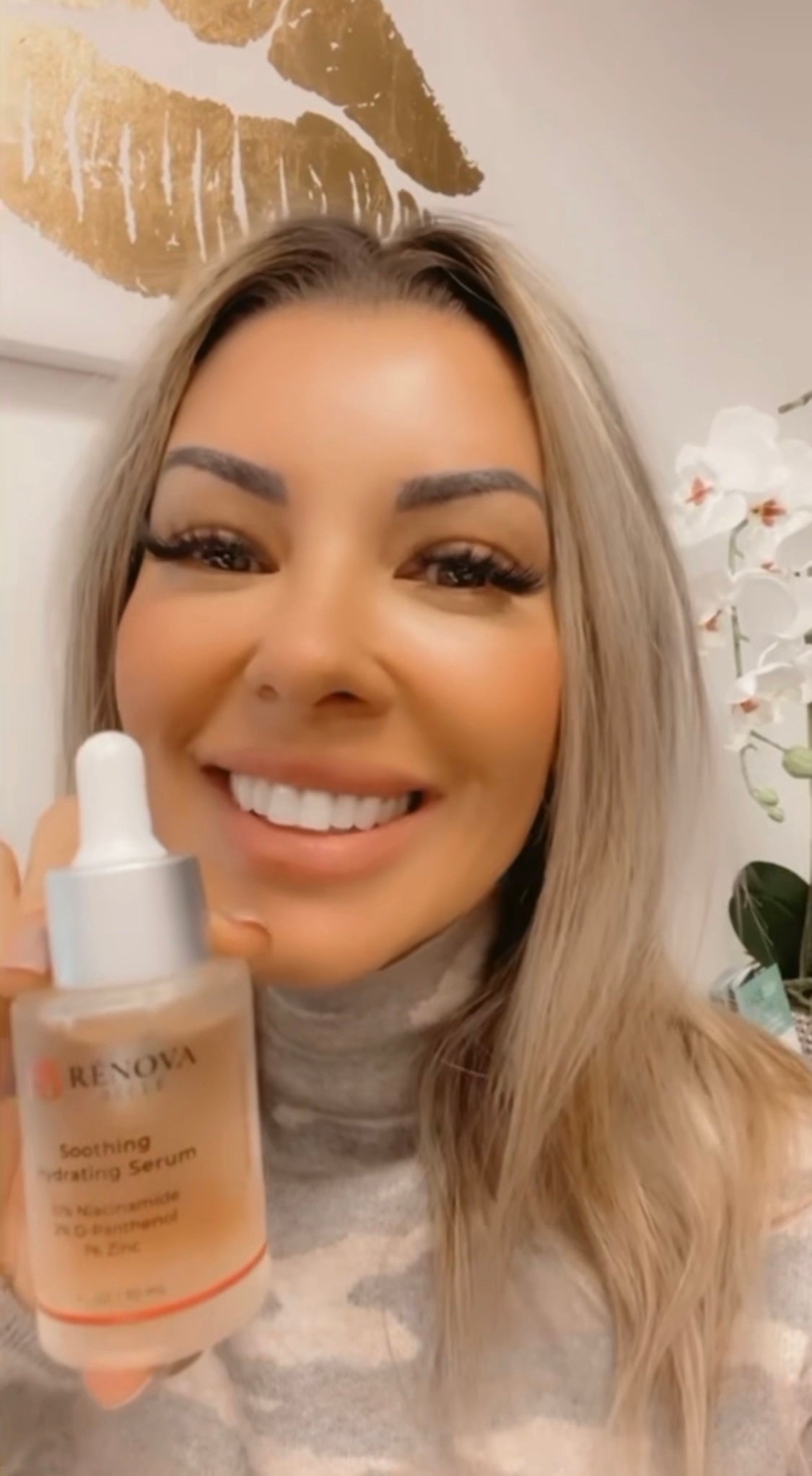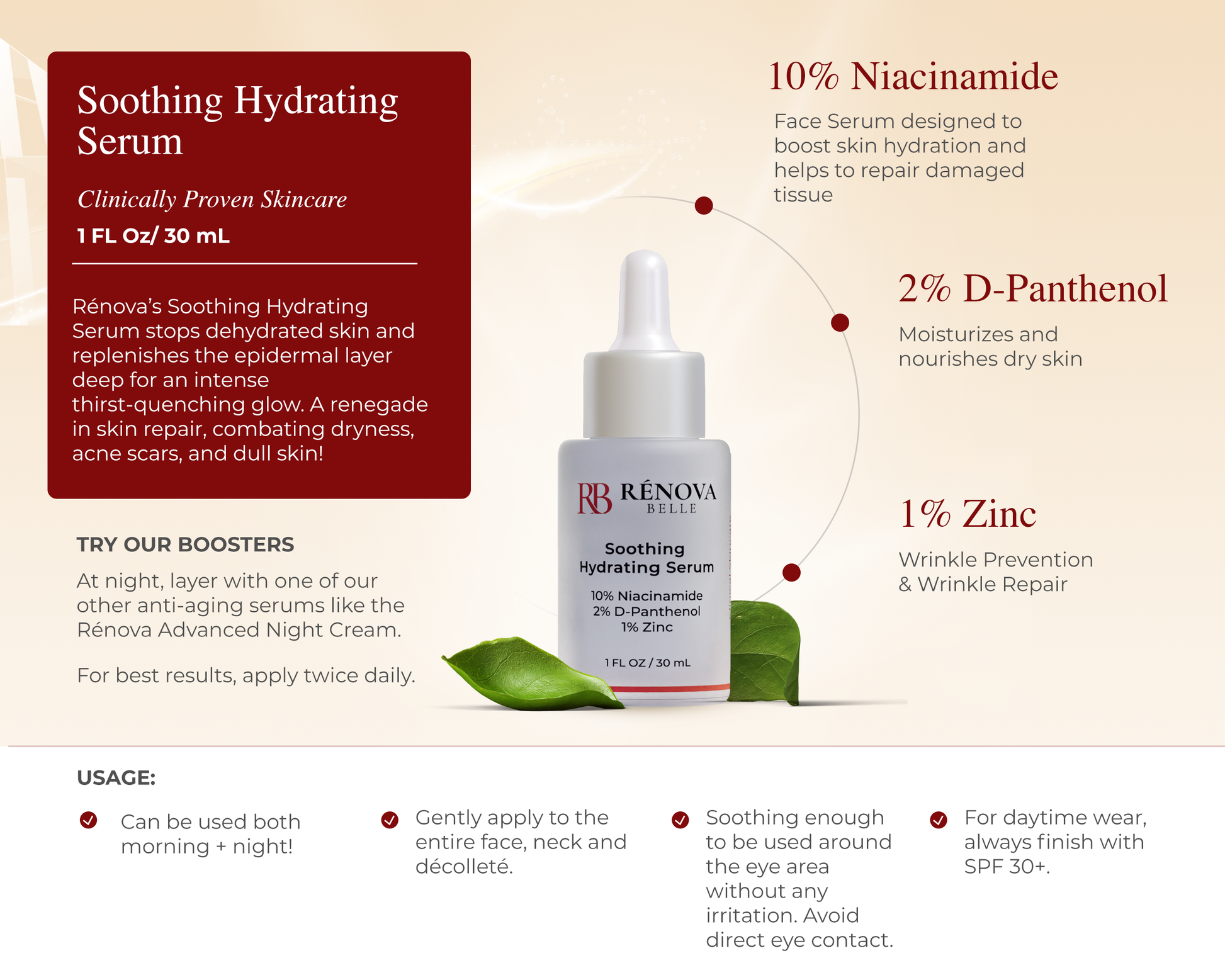 "Soothing Hydrating features Pure 10% Niacinamide (Vitamin B3) to calm sensitive skin and reduce redness. Niacinamide supports the skin barrier (the outer surface of skin), increases its resiliency, and improves texture by making pores look smaller. It also helps balance oil production, recommended to treat rosacea and acne prone skin. Soothing Hydrating is also formulated with 2% D-Panthenol to heal and repair the damaged cells and tissues. Additionally, 1% Zinc mattifies your skin while discouraging bacterial growth. Rénova Soothing serum also contains White Tea, Aloe, Oats, Mushroom extracts, a blend of amino acids, Vitamin E , and—bonus!—it’s good for all skin types." + "
