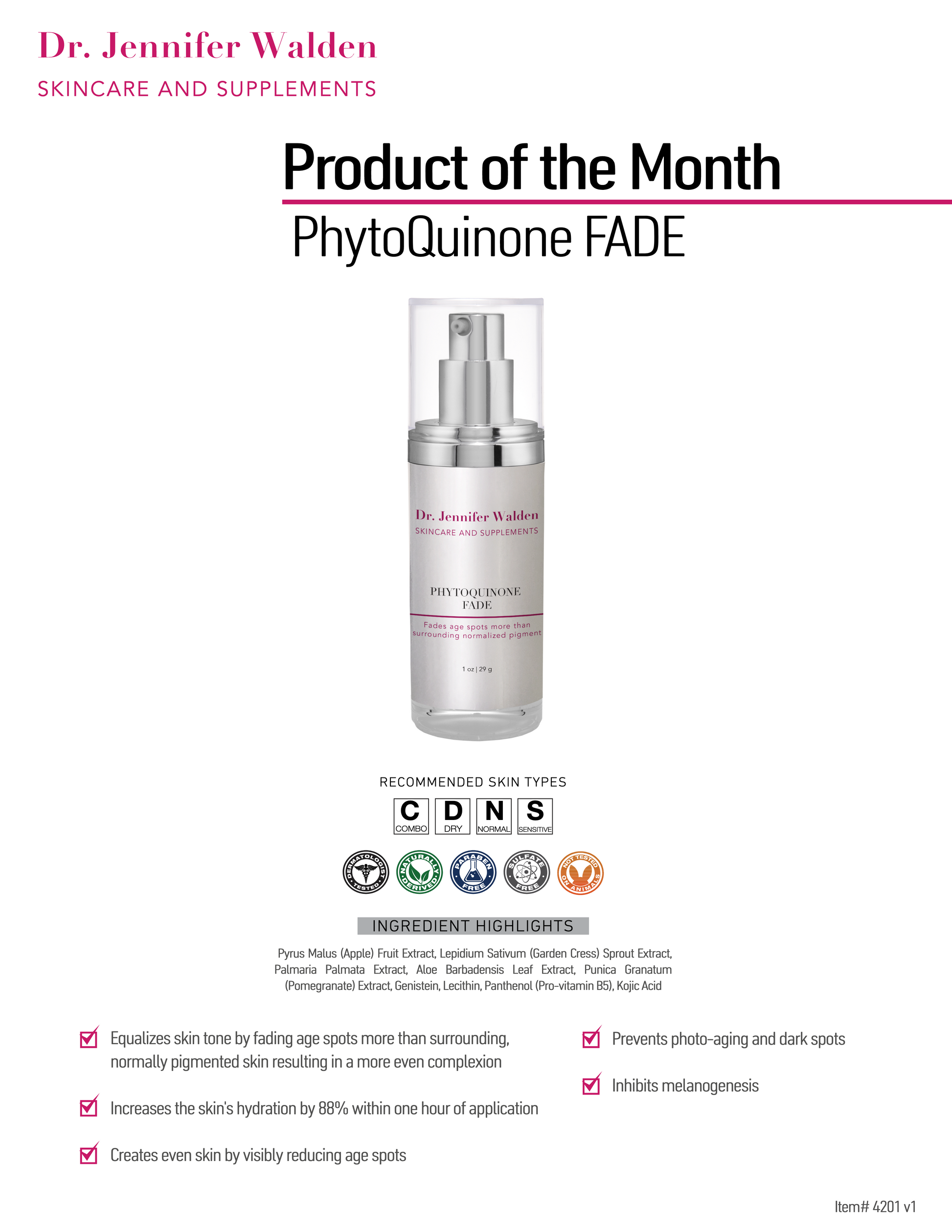 Our advanced synergistic formulation of ingredients in PhytoQuinone FADE results in a visibly brighter, more even skin tone by eliminating dark spots successfully through lightening agents and providing powerful antioxidant protection intercepting future sun-related pigment production.